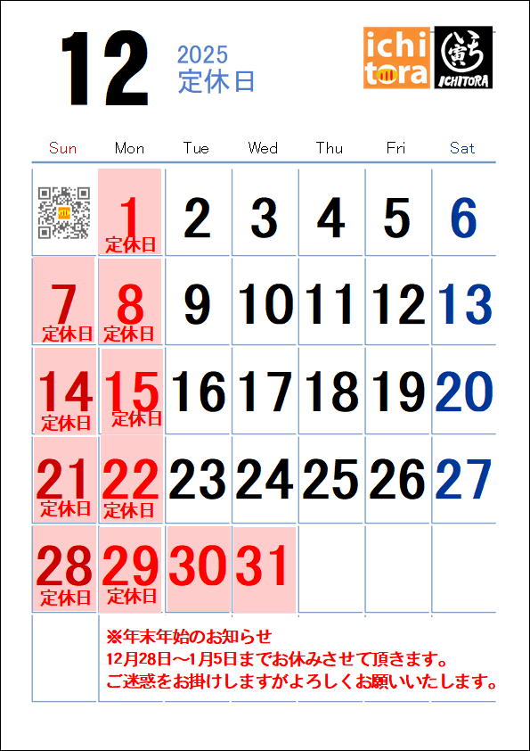 12月の定休日のお知らせ