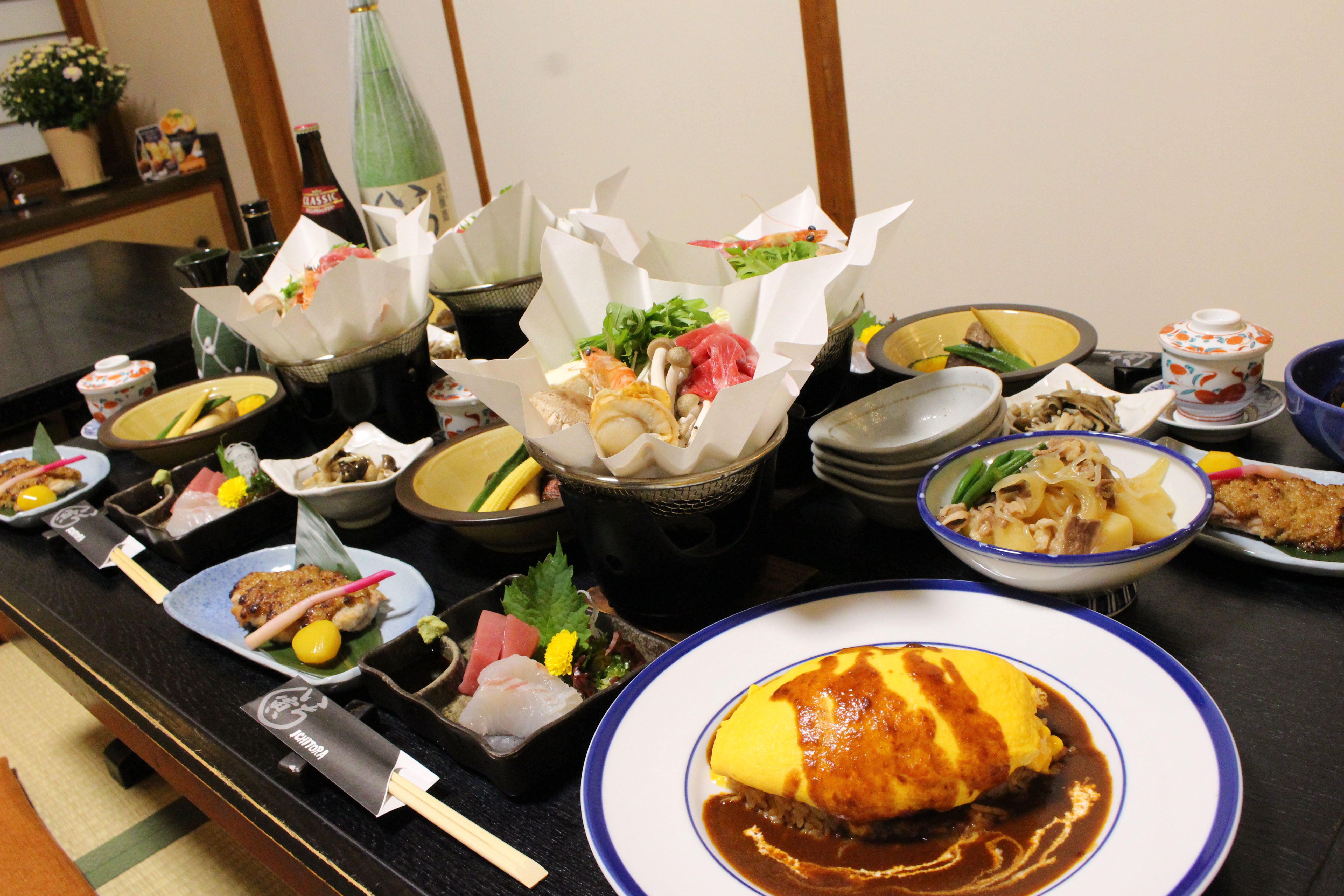 前菜、お造り、茶碗蒸し、揚げ物、大皿料理3品、本日の魚料理、本日の一人鍋、お食事は人気のオムライス、デザート