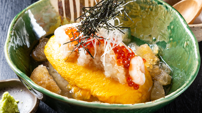 炊き立てご飯に作りたてだし巻き風オムレツをのせ鰹だしの効いたキンキンに冷えただしと凍らせただしおろしとイクラを乗せさっぱりとした味わいにしました暑い名古屋にぴったりです。 税込¥1450